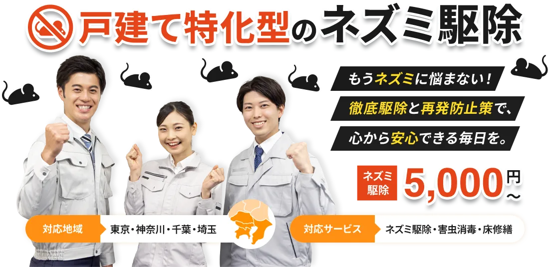 ネズミの侵入口を徹底的に遮断し、糞尿の清掃除去、死骸の除去、建材の修繕、消臭・殺菌消毒、ダニ・ノミ駆除など、徹底的に二次被害対策を行います。